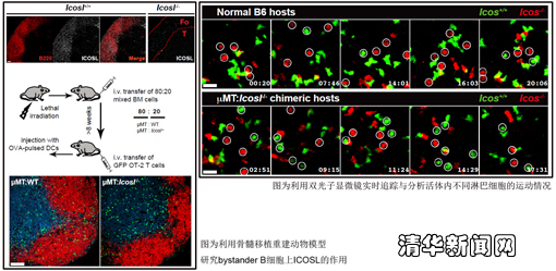 图为利用骨髓移植重建动物模型研究bystander B细胞上ICOSL的作用和利用双光子显微镜实时追踪与分析活体内不同淋巴细胞的活动情况。